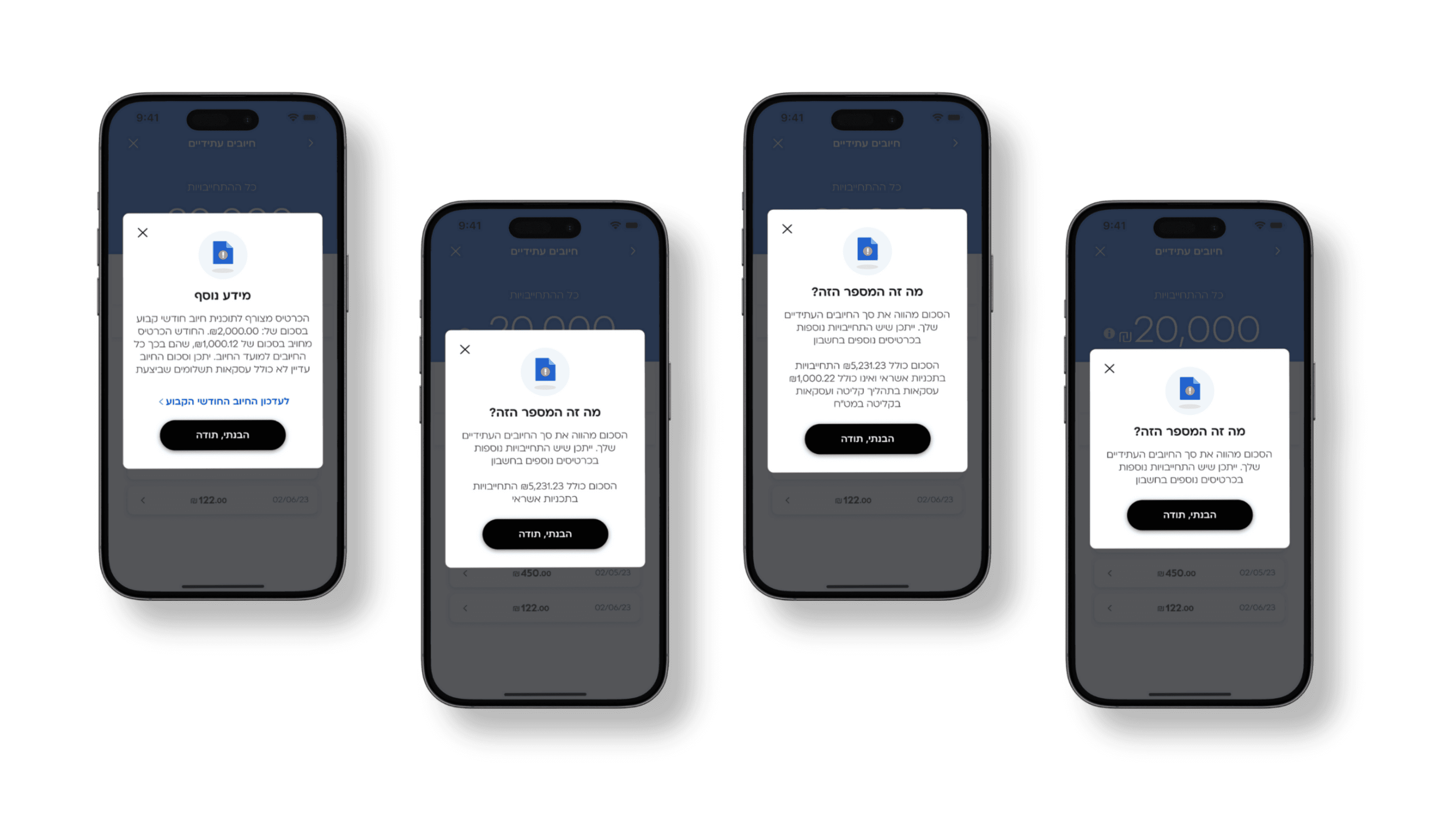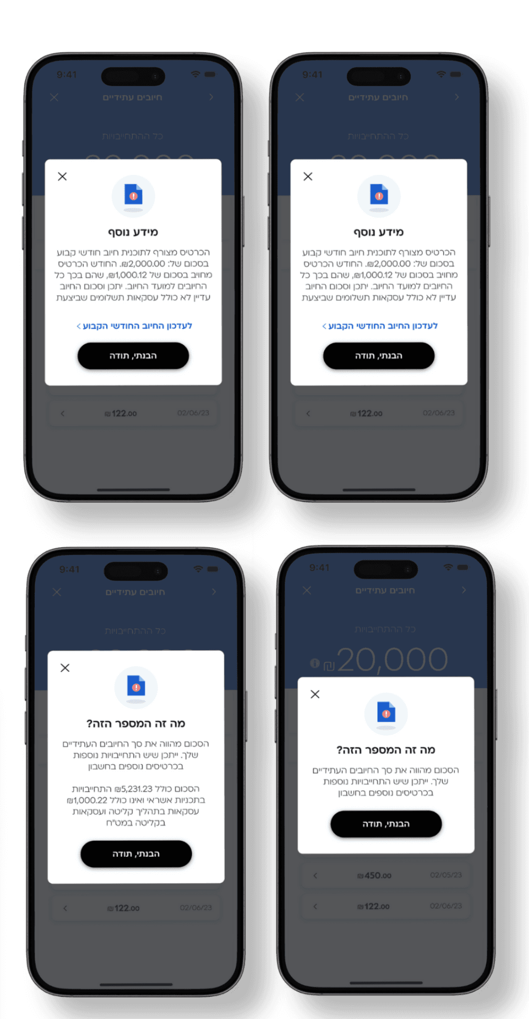When the user taps the total payment for the card - they will be redirected to the transactions list module, that shows the transactions that the sum that was pressed is made of - a screen that I also took a part in designing. There, the user can see the various transactions making each card’s billing date, and drill down to see the full details of each transaction - another screen that I designed.