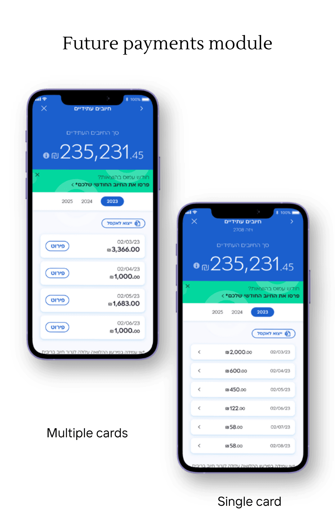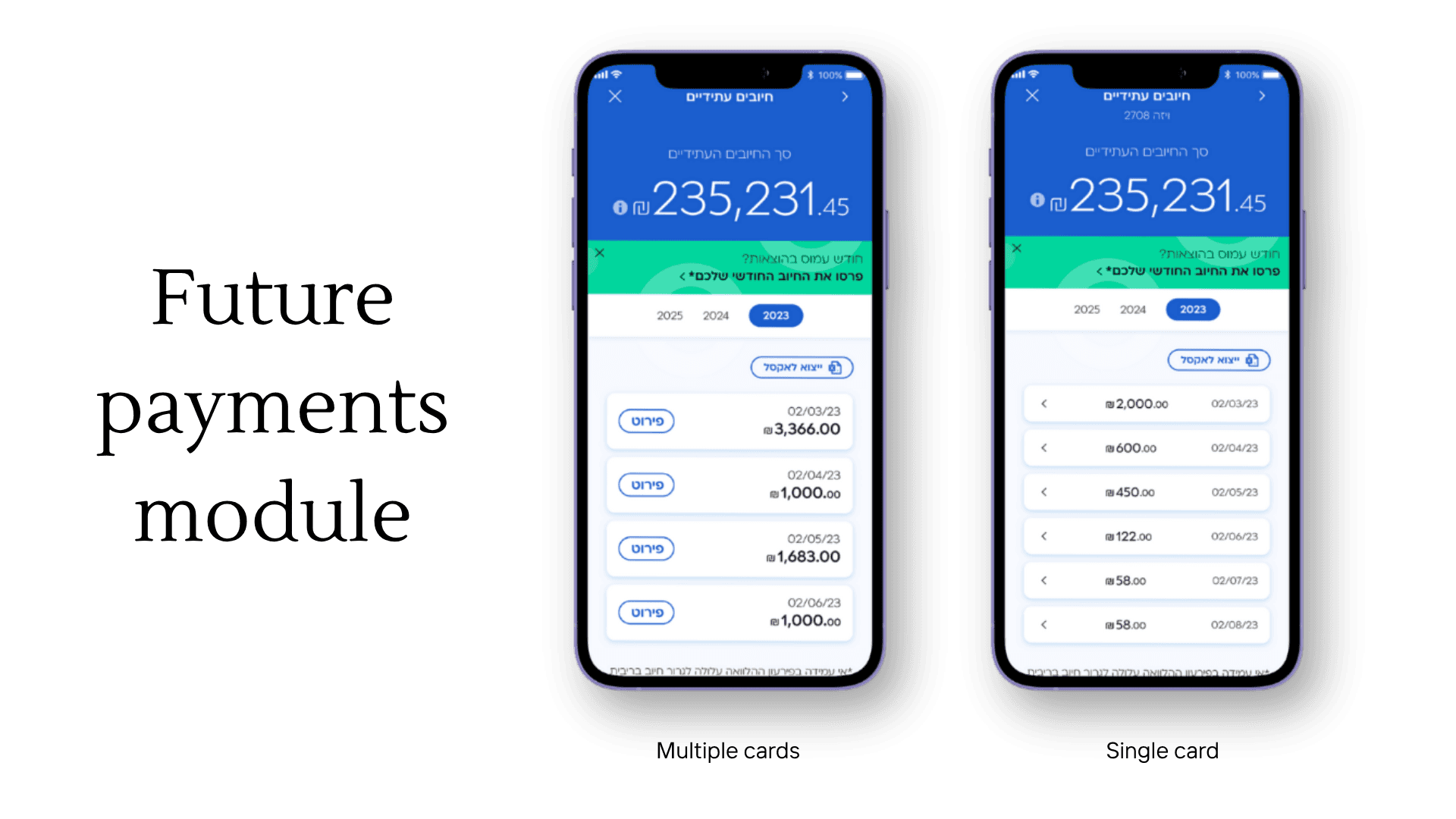 Totals might be confusing across cards and billing dates, so the design had to take it in account. The users were roughly divided to two groups: single vs. multiple card holders, each group makes about half of the users. Each group had the same need: to see total payments-by-months. In case of multiple cards making up the payment, the split by card had to be shown. The goal was to do as little as possible segment-tailoring and still provide high value.