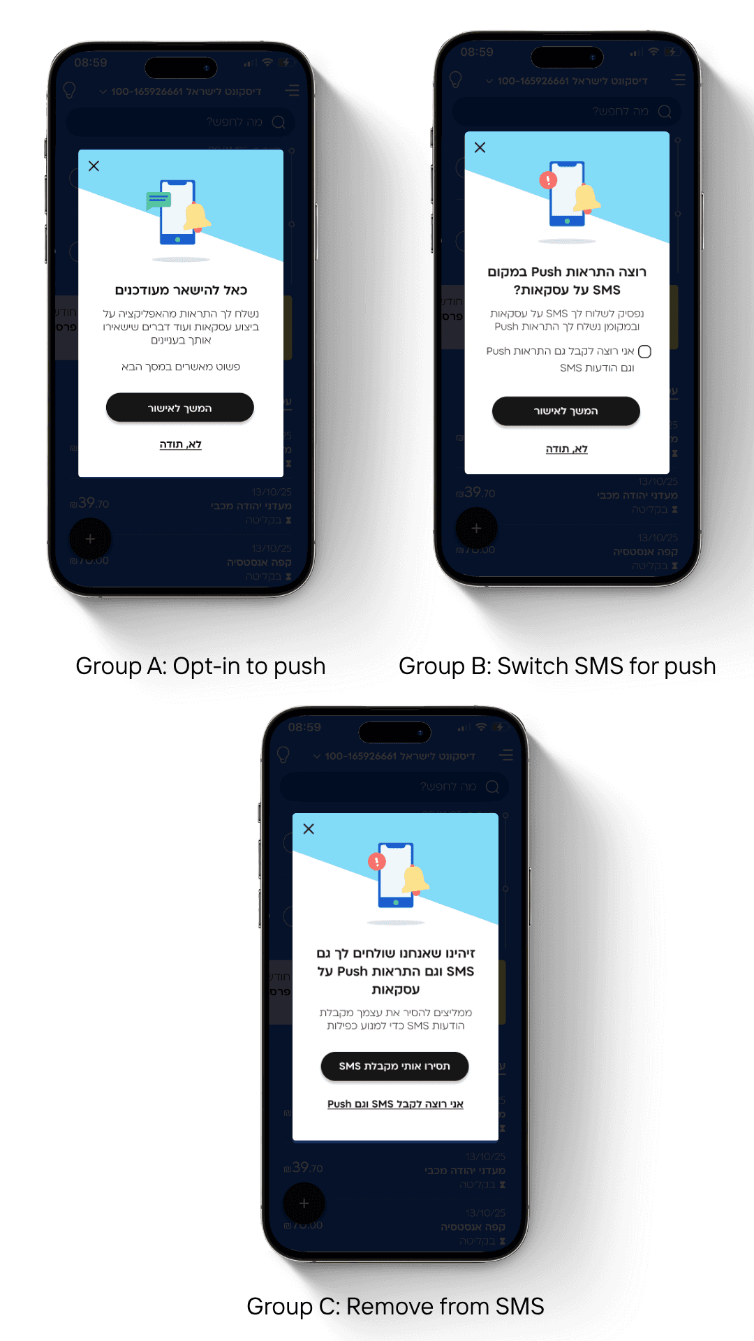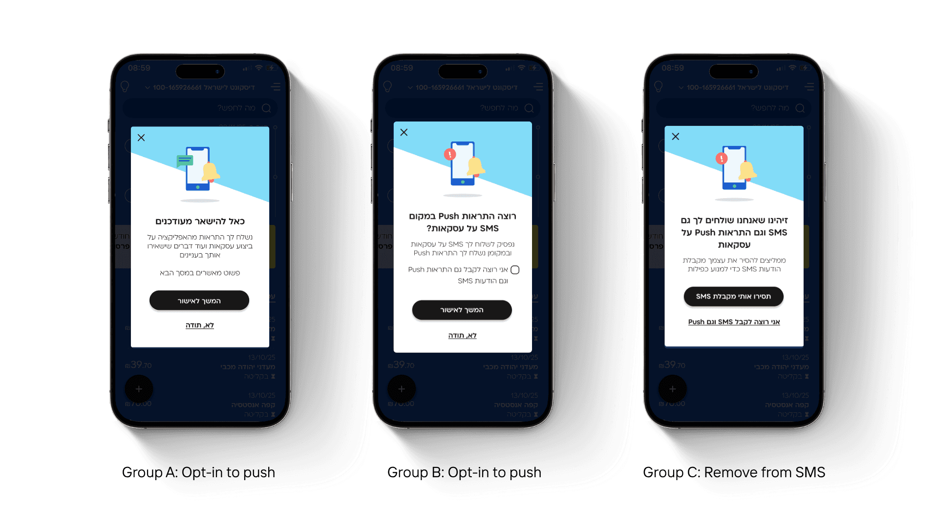 The goal was to to leave our users getting push notifications only. To do it - I divided them into 3 different groups with tailored CTA: