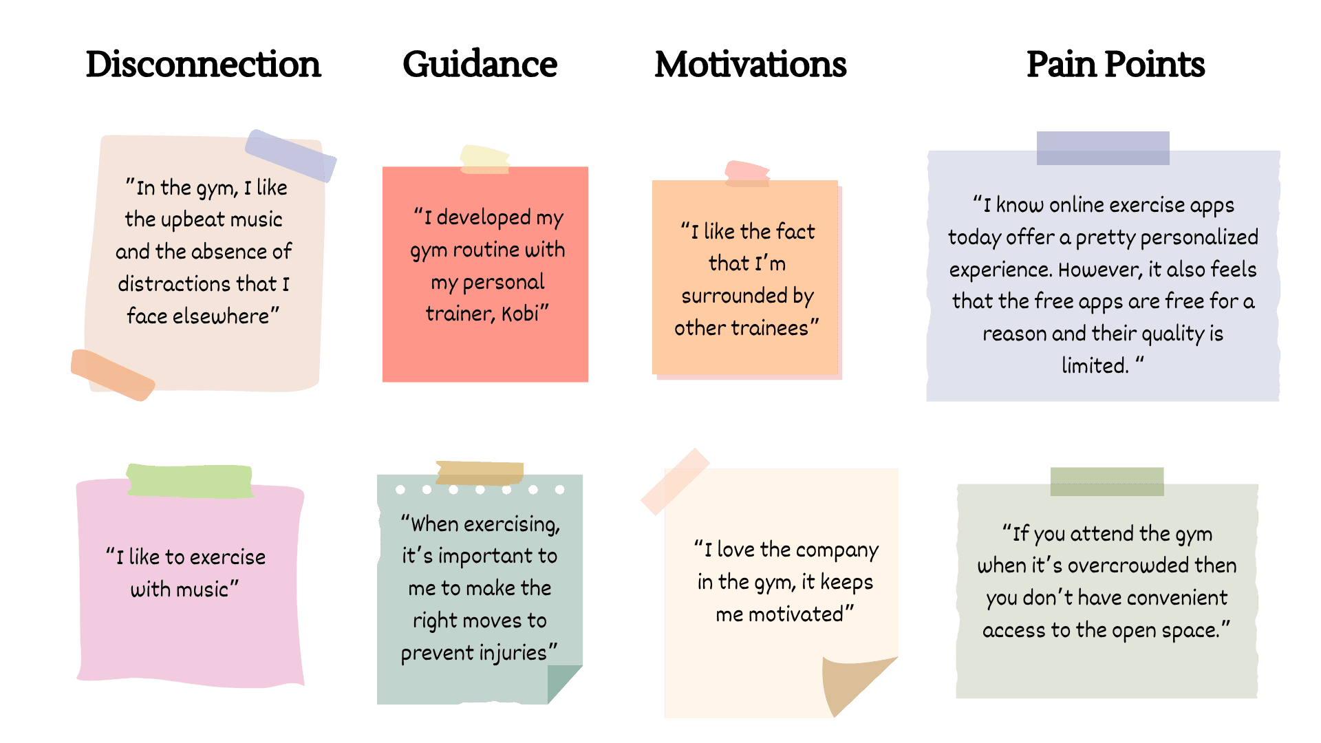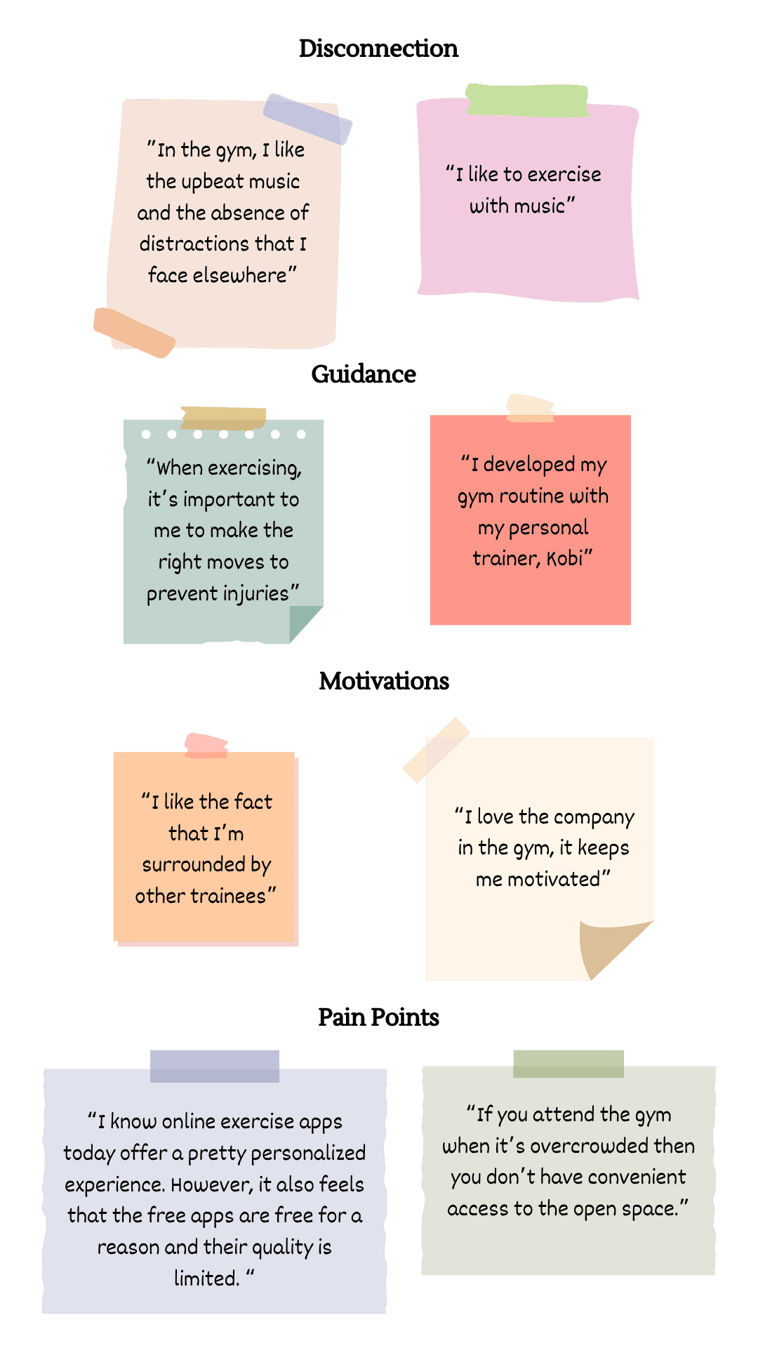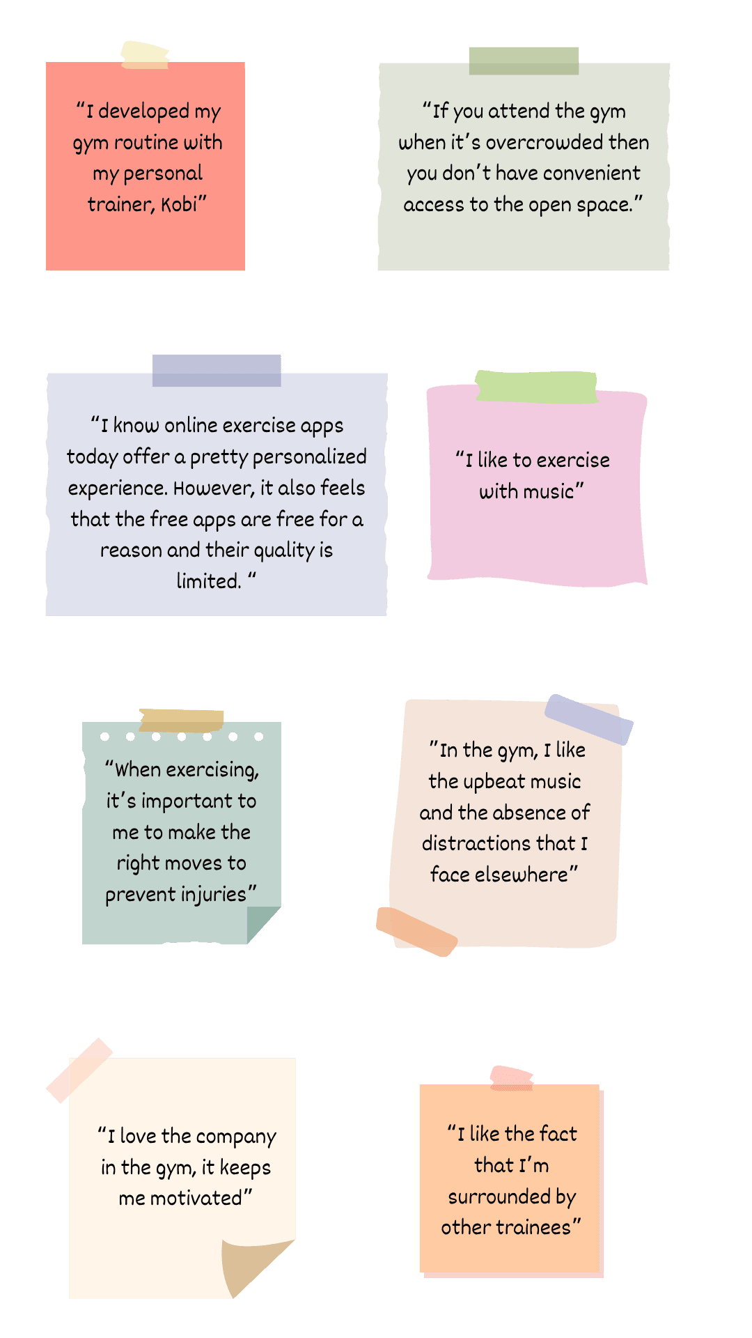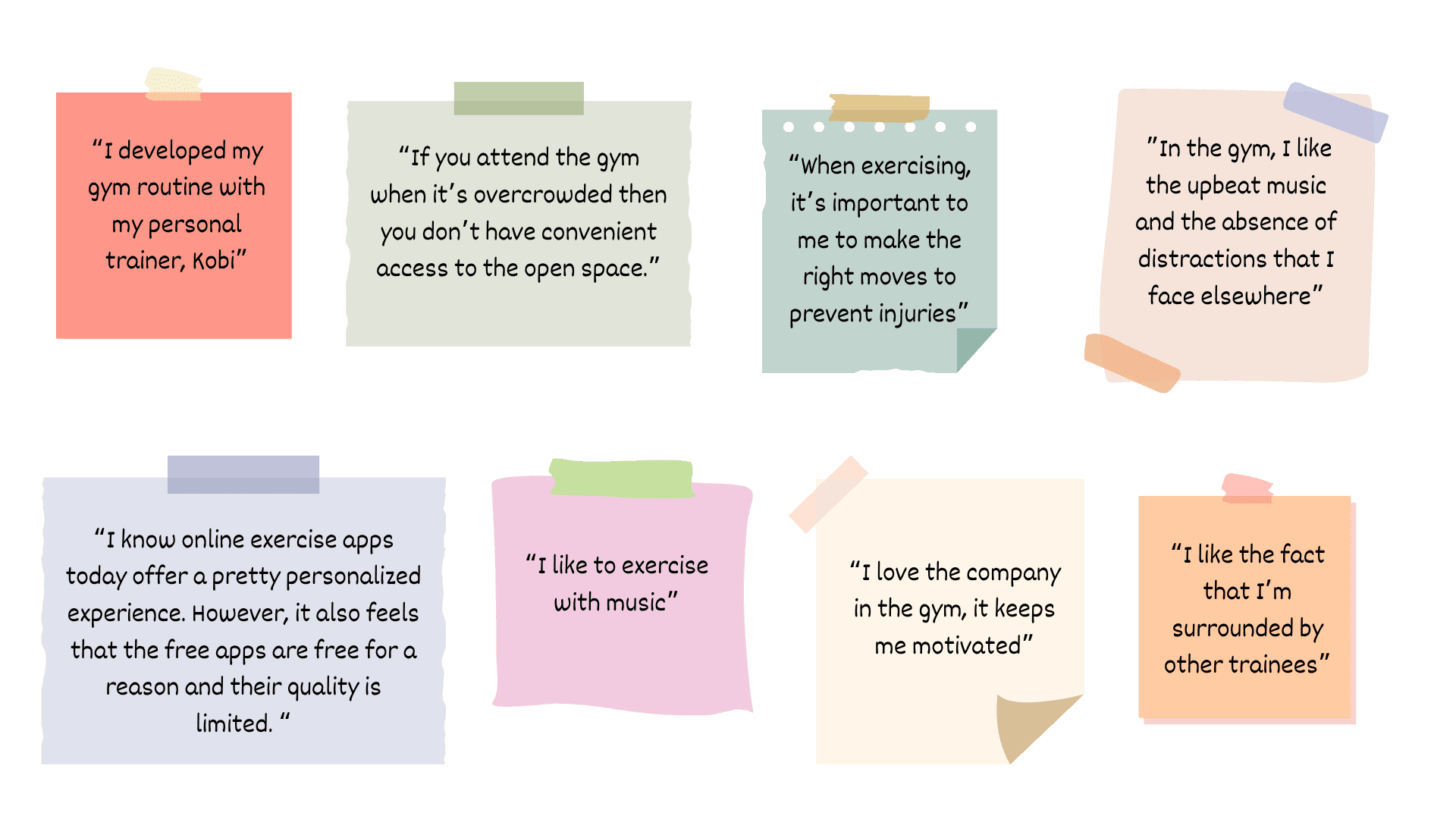 To understand this, I conducted user interviews with a segment of people in their 30s who exrcise and don’t do any of their exercise online. The purpose was to gain insights for the product team that could decrease skepticism and increase satisfaction with online exercise.